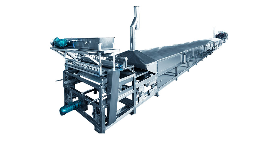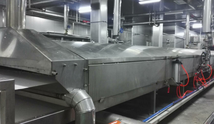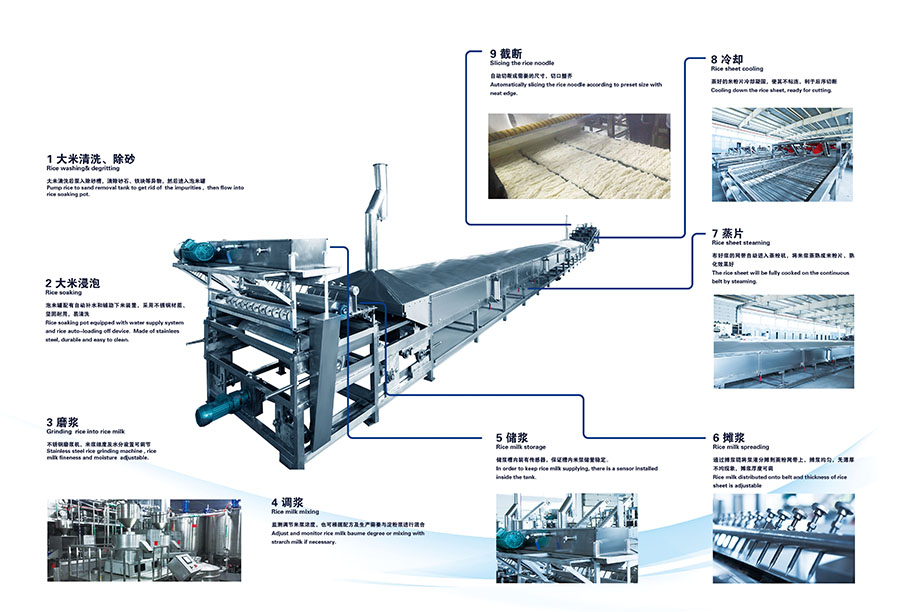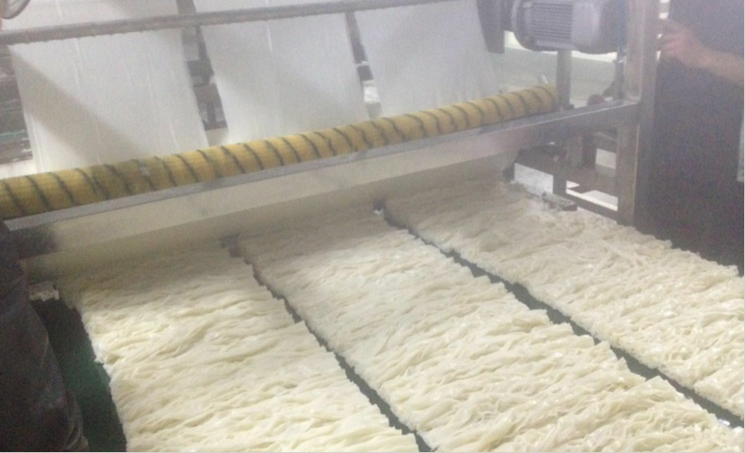 布好漿的網(wǎng)帶自動(dòng)進(jìn)入蒸粉機(jī),將米漿蒸熟成米粉片,熟化效果好;